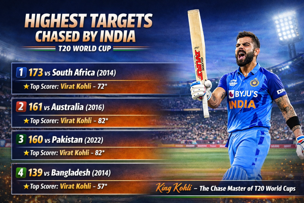 ಟಿ20 ವಿಶ್ವಕಪ್ನಲ್ಲಿ ಭಾರತದ ಅತ್ಯಂತ ದೊಡ್ಡ ಚೇಸ್ಗಳು ಬಹುತೇಕ ಚೇಸ್ ಮಾಸ್ಟರ್ ವಿರಾಟ್ ಕೊಹ್ಲಿಯ ಹೆಸರಿನೊಂದಿಗೇ ಇದೆ.