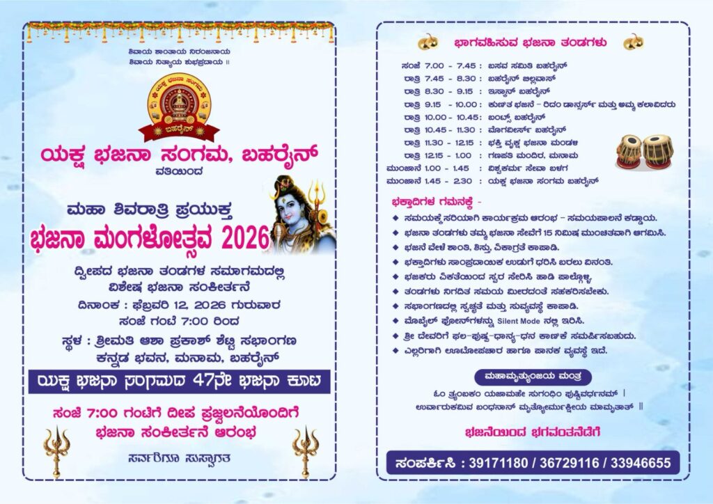 ಯಕ್ಷ ಭಜನಾ ಸಂಗಮ, ಬಹರೈನ್ ವತಿಯಿಂದ ಮಹಾ ಶಿವರಾತ್ರಿ ಪ್ರಯುಕ್ತ ಭಜನಾ ಮಂಗಳೋತ್ಸವ–2026 ಅನ್ನು ಗುರುವಾರ, ಫೆಬ್ರವರಿ 12ರಂದು ಮನಾಮಾ ನಗರದ ಕನ್ನಡ ಭವನ ಆಡಿಯಟೋರಿಯಂನಲ್ಲಿ ಆಯೋಜಿಸಲಾಗಿದೆ.